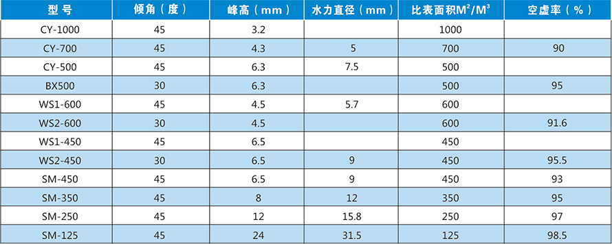| 圖例 | 名稱 | 型號 | 材質(zhì) | 比表面積M2/M3 | 填料特點 |